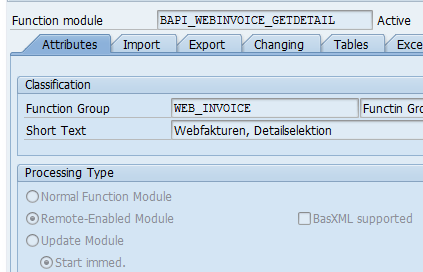 Identify the FM to be called from other system (Sys2 here).Let us say we need to call Function Module BAPI_WEBINVOICE_GETDETAIL from Sys2 to get the Invoice details.The first prerequisite is the called FM should be remote enabled as below :