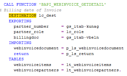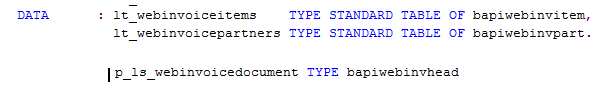 Here lc_dest is constant for destination "Zwebinvoice" and sent values from my report to the FM as Import parameters and found the web Invoice Items in lt_webinvoiceitems. Data type as below: